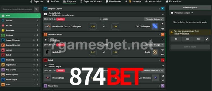 O 874Bet oferece uma grande seleção de opções de apostas em e-sports com probabilidades competitivas